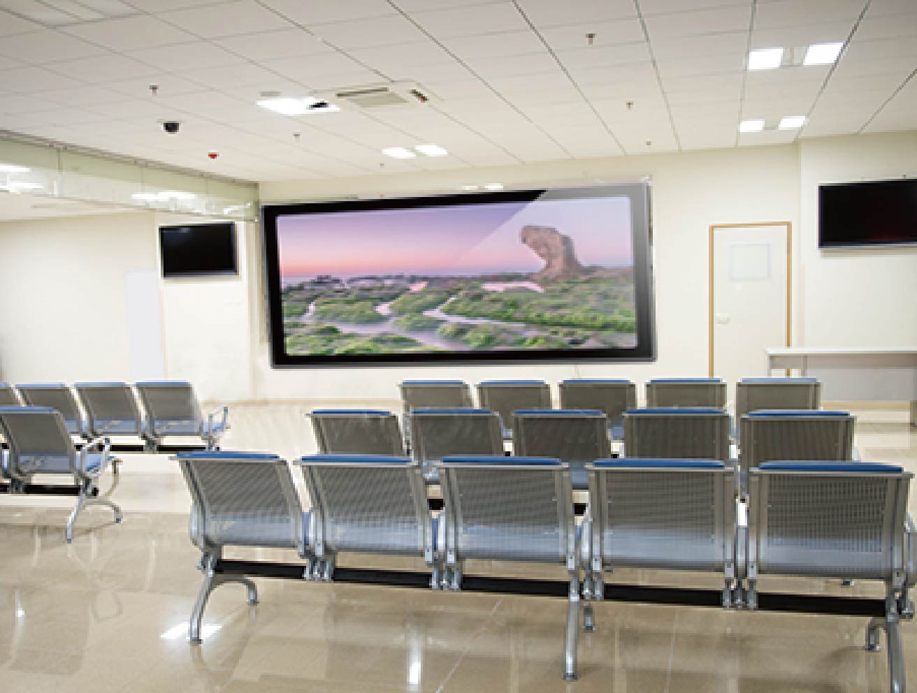 ■往来の多いロビー付近の壁面に大画面マルチディスプレイを