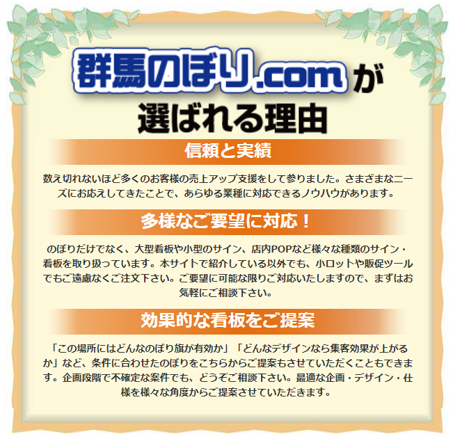 群馬のぼりは、群馬県前橋市を中心に安心・低価格・高品質のオリジナルのぼり旗のデザイン・制作を行っています。