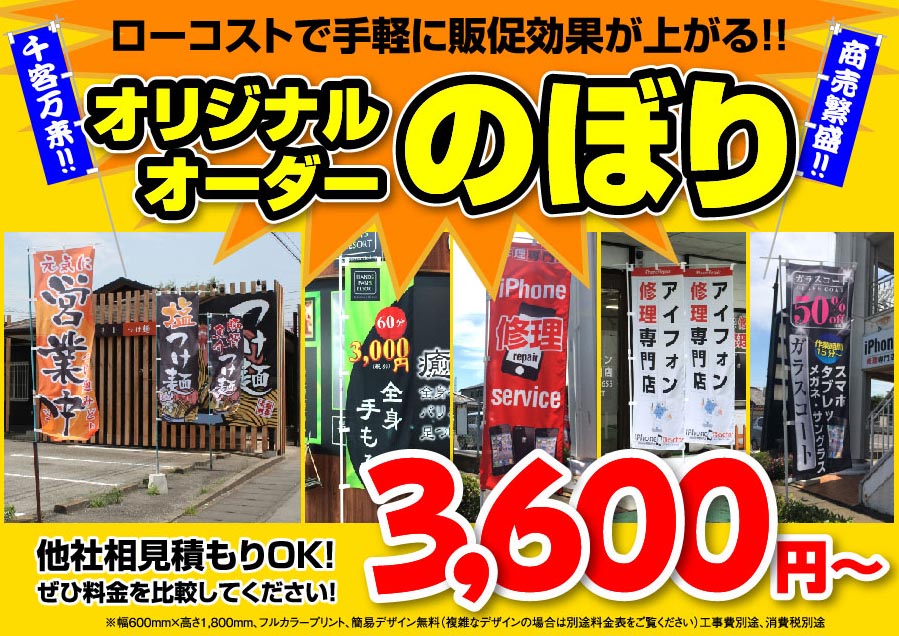 のぼり旗は比較的安価で気軽にご注文できます。少ない予算で最大の集客があり、販売促進効果も抜群です!!