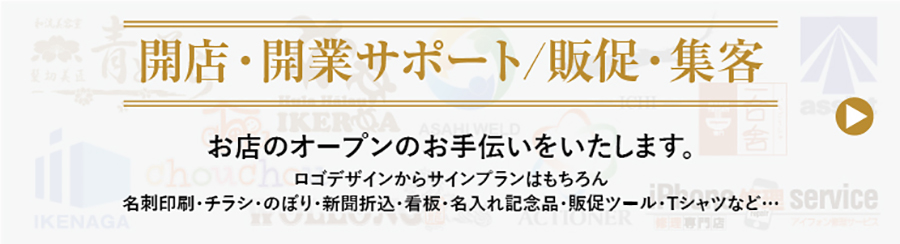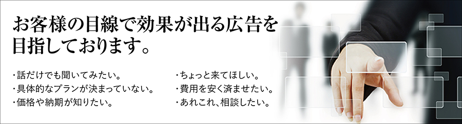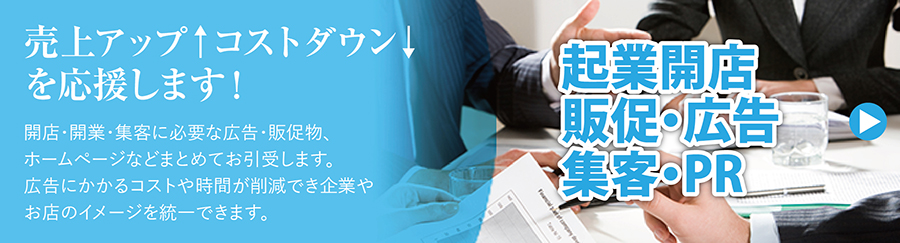 これから事業を始めたいけど、広告・チラシ、看板、ホームページ制作、どこ頼んだらいいか わからない。広告宣伝・販売促進をトータルプランニングいたします!例えば、お店のロゴ!お店にとって顔となる看板はもちろん広告、チラシ、封筒、領収証、ハンコなど さまざまな物に使用します。簡易なロゴを使ってしまうと後から変更するとなると、すべて作りなおさなくては いけません。弊社では、お客様に満足して頂けるデザインを提供いたします。もちろん企業様だけではありません。個人様も大歓迎です。お気軽にお問い合わせ下さい。
